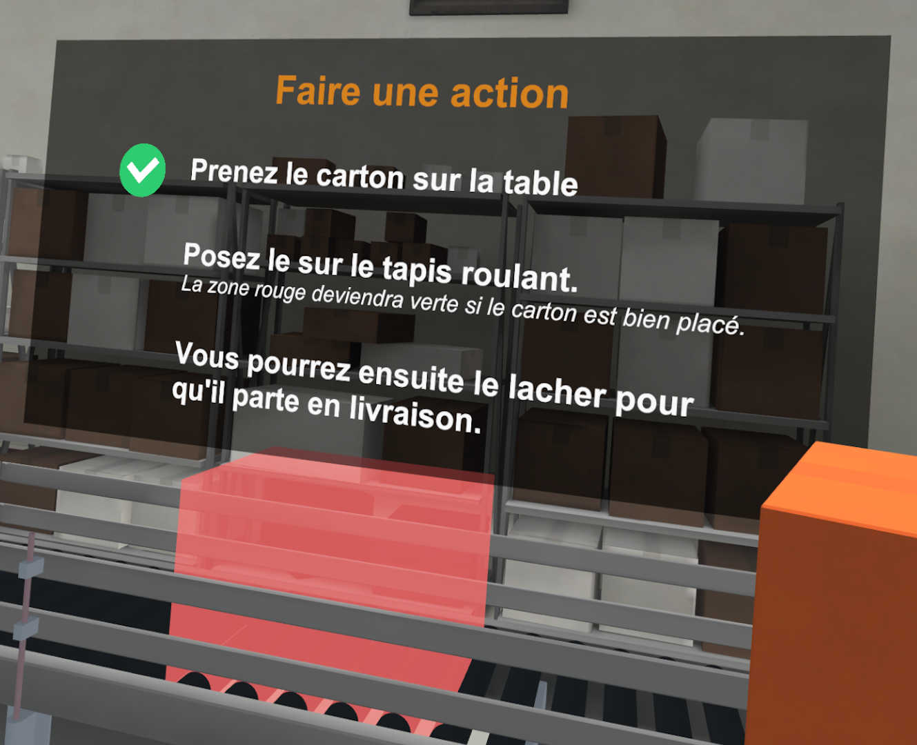 Il faut pouvoir attraper des objets, les déplacer, interagir avec, intégrer des Q.C.M. existants, des vidéos (lisible sur une tablette virtuelle dans la formation virtuelle), etc.