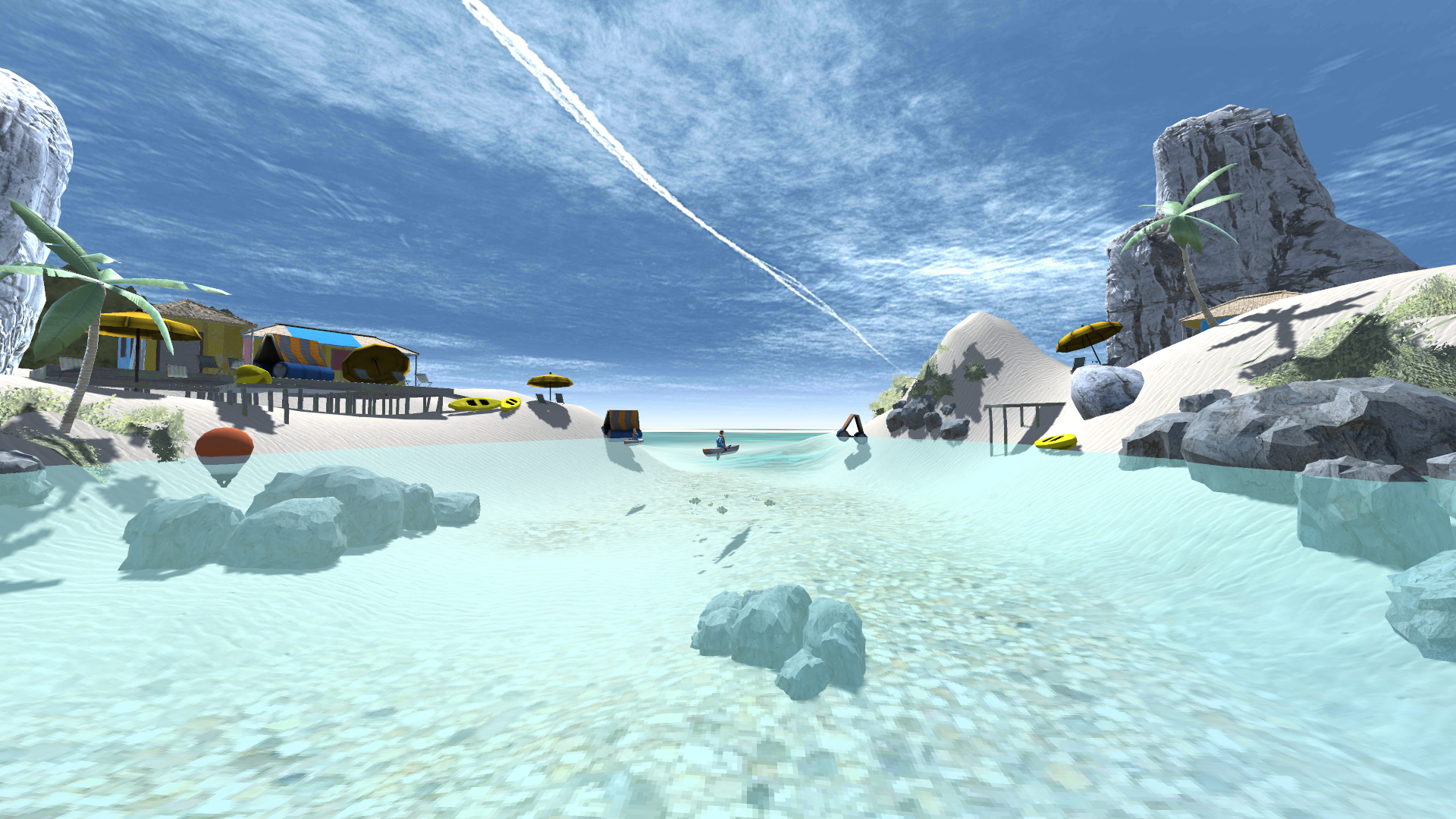 Nos graphistes 3D ont réalisé cette île et nos animateurs 3D ont préparé un chemin qui est suivi automatiquement par votre Kayak. Pour le prototype nous n’avons pas voulu que les pagaies influencent votre direction, vous suivez simplement une équipe de personnages animés sur un chemin prédéfini. Vous pouvez néanmoins bouger vos pagaies avec les manettes du casque de réalité virtuelle, ce qui rajoute énormément de réalisme et d’immersion.