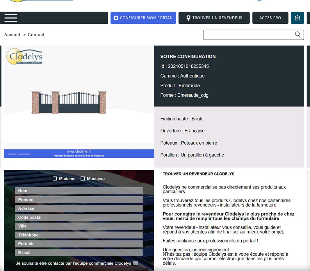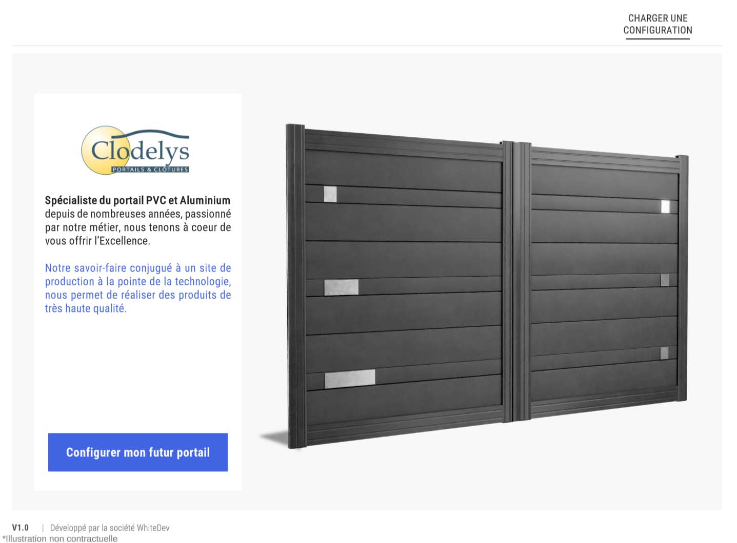 Le configurateur Clodelys s’adapte parfaitement à leur charte graphique, mais aussi à leurs modèles, gammes et design de portails. Ce configurateur se veut complet et dans l’air du temps, sans plug-in, avec de la 3D, de la réalité augmentée, de la réalité virtuelle et une intégration rapide sur le site de Clodelys réalisé par nos équipes.