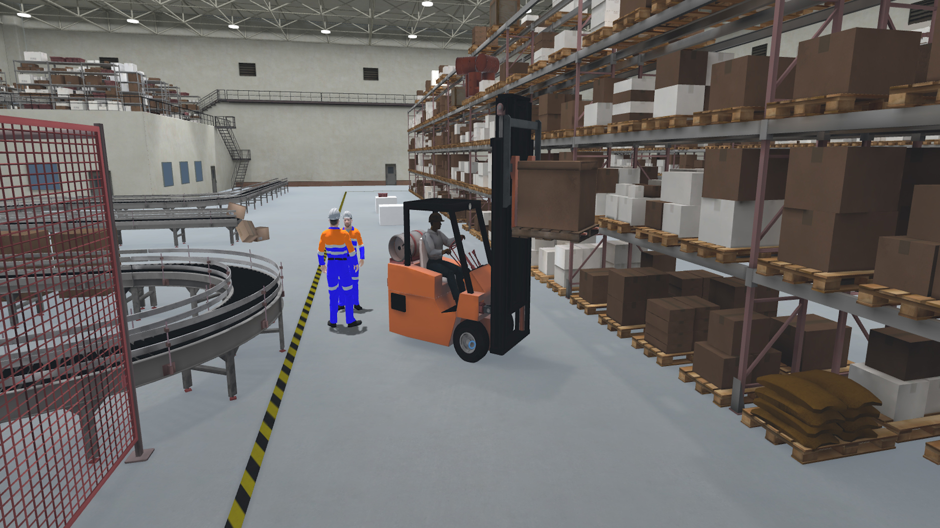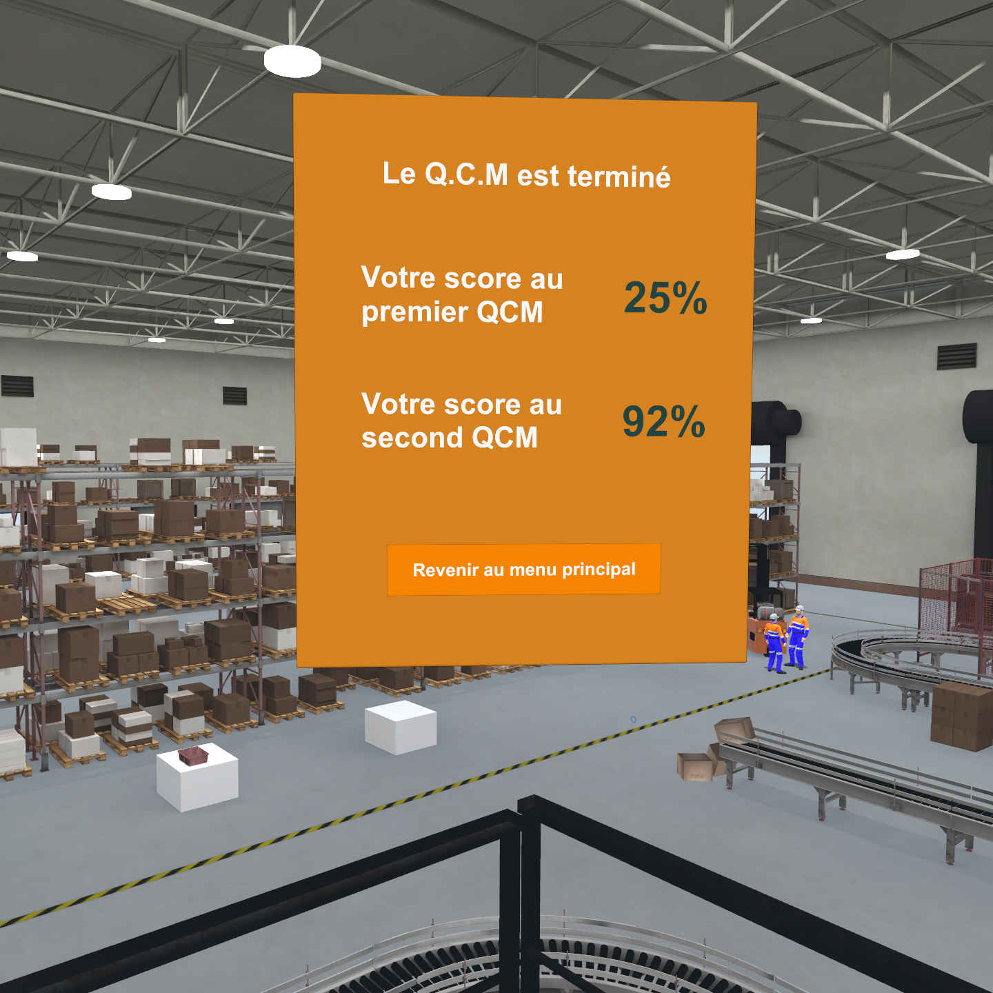 L’entrepôt virtuel se présente comme un entrepôt physique, il y a des ouvriers animés, des chariots élévateurs qui se déplacent, du bruit, des actions possibles (comme trouver le bon symbole d’un produit chimique) etc. Le but est simple : rendre l’expérience assez immersive pour que l’élève puisse s’y croire et ainsi faire la formation dans les meilleures conditions possibles. L’élève doit être acteur de sa formation.