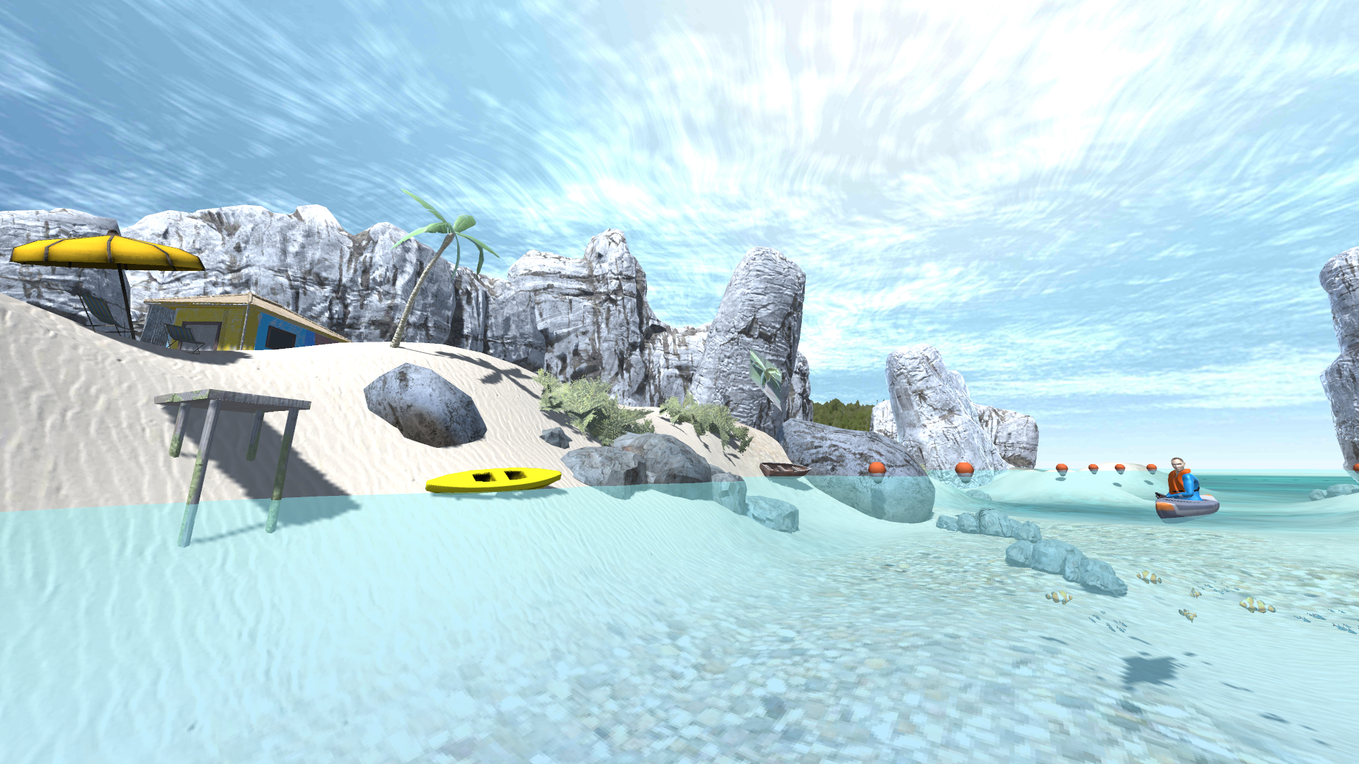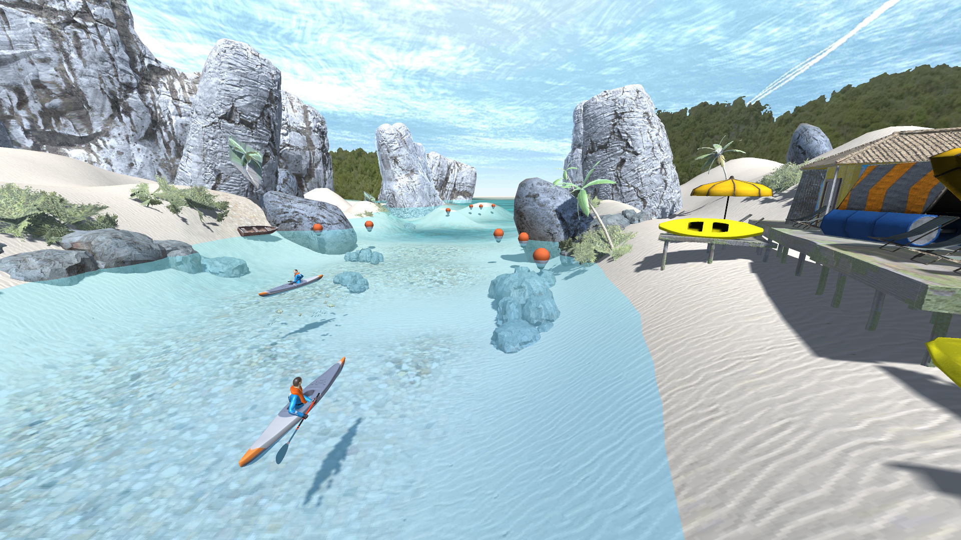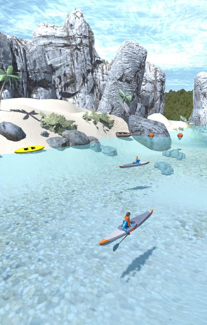 Nos graphistes 3D ont réalisé cette île et nos animateurs 3D ont préparé un chemin qui est suivi automatiquement par votre Kayak. Pour le prototype nous n’avons pas voulu que les pagaies influencent votre direction, vous suivez simplement une équipe de personnages animés sur un chemin prédéfini. Vous pouvez néanmoins bouger vos pagaies avec les manettes du casque de réalité virtuelle, ce qui rajoute énormément de réalisme et d’immersion.