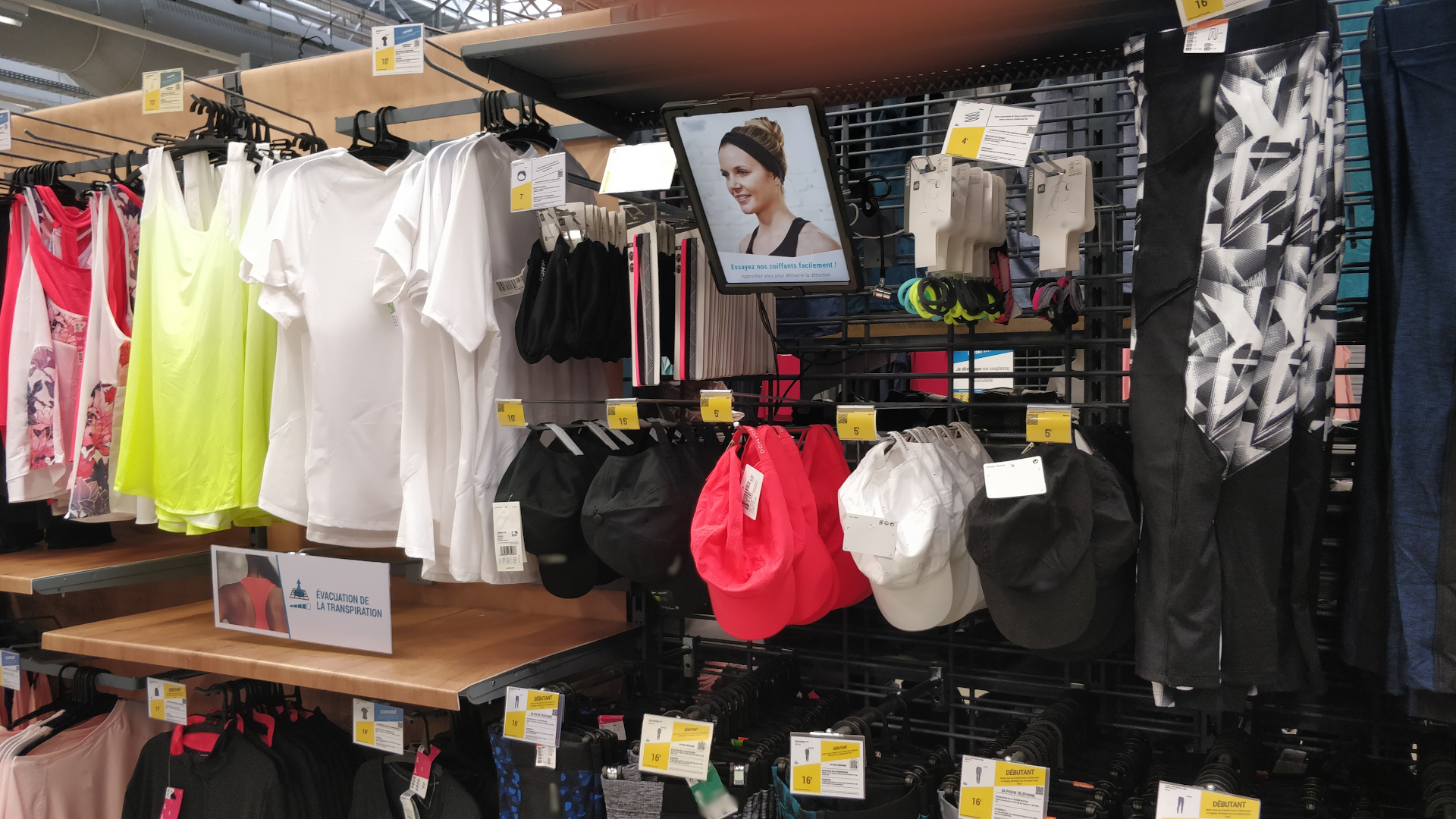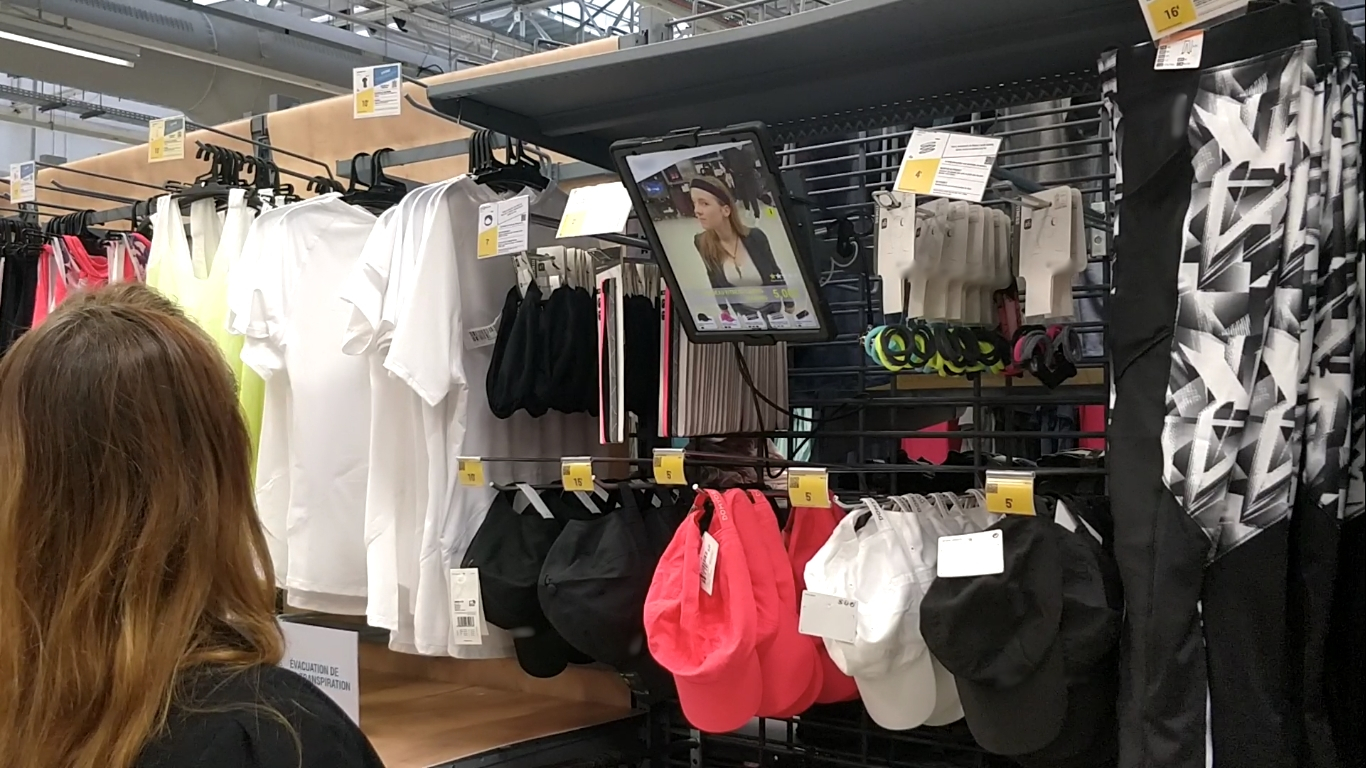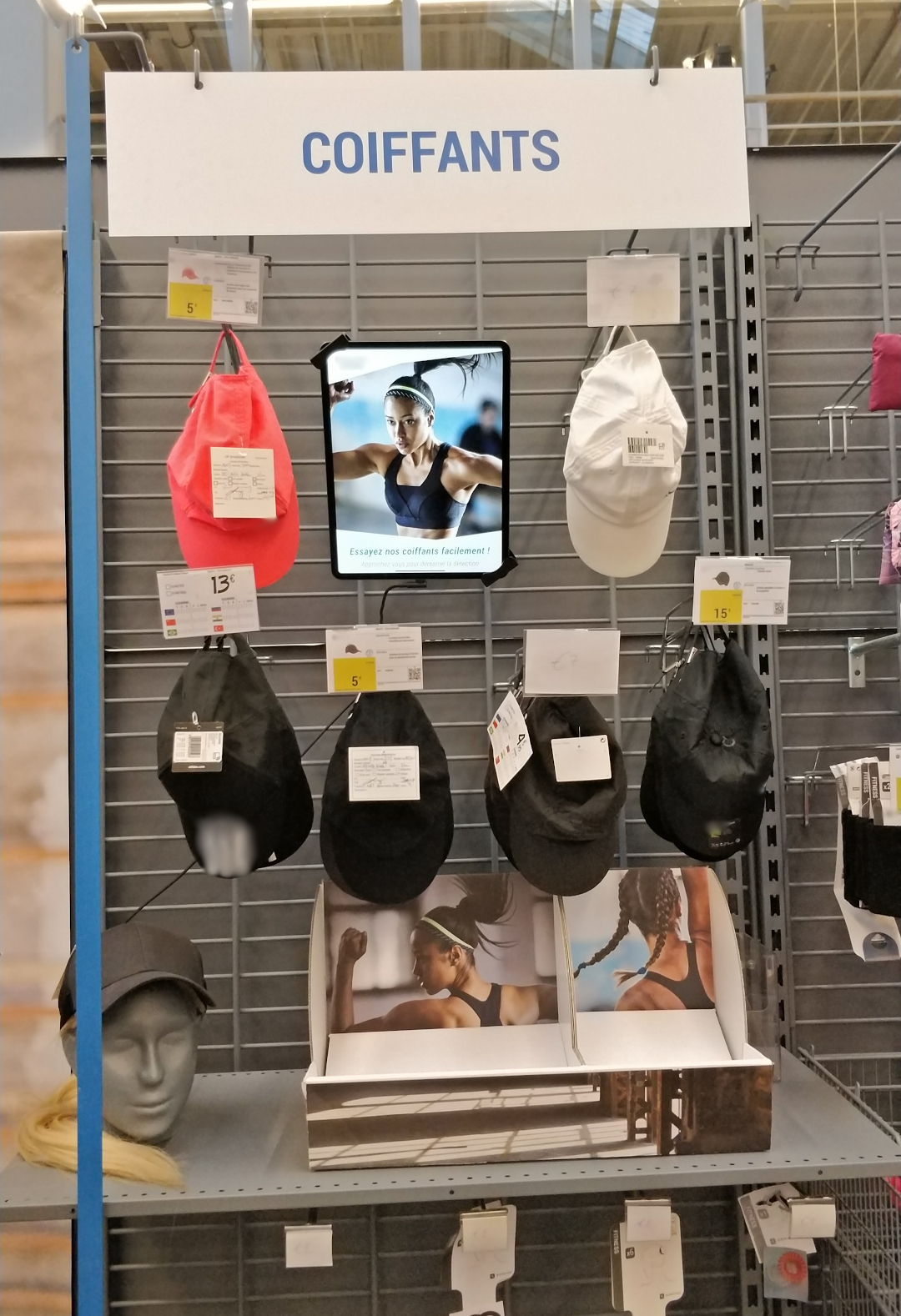 Une fois un visage détecté, un produit (ici un coiffant d’une marque de distribution d’articles de sport) est automatiquement positionné sur la tête du client.